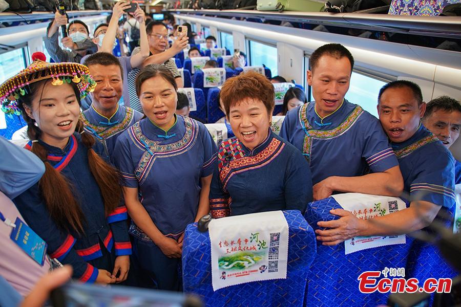 Passengers pose for a photo on Fuxing bullet train G4308 as it departs Nanning, capital of South China's Guangxi Zhuang Autonomous Region, for Guiyang, capital of Guizhou Province, on Aug 31, 2023. (Photo/China News Service)