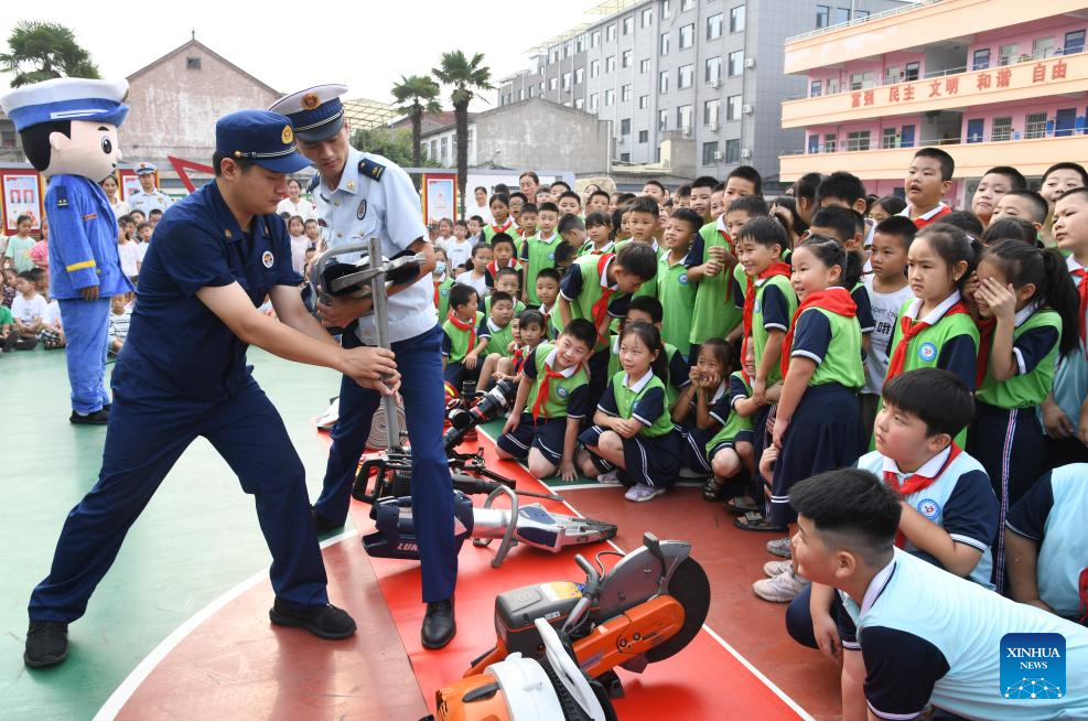 A firefighter (back) introduces firefighting equipment to students at a primary school in Longyan City, southeast China's Fujian Province, Sept. 1, 2023. The new school semester kicked off in many parts of China on Friday. (Photo by Zhou Yangdong/Xinhua)
