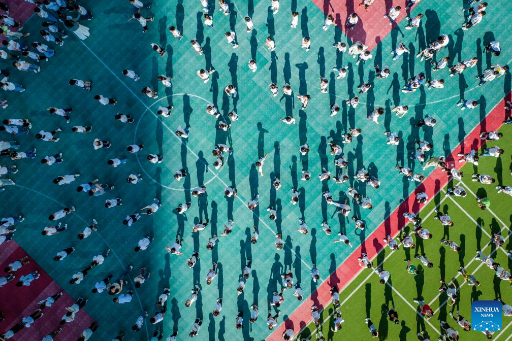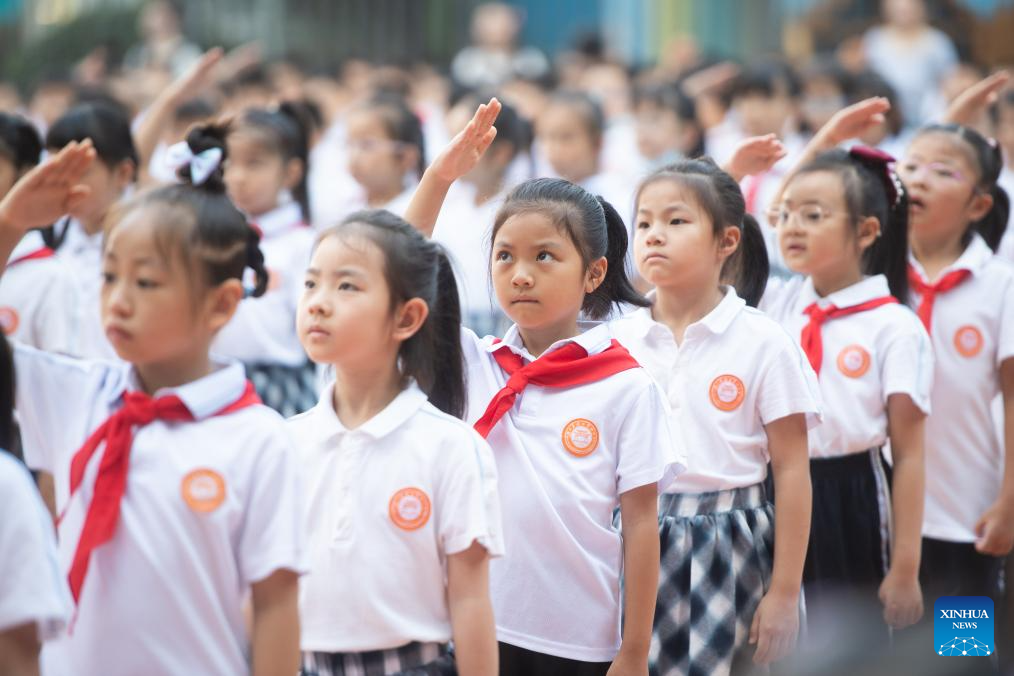 Students and teachers attend a ceremony for the new semester at a primary school in Wuhan City, central China's Hubei Province, Sept. 1, 2023. New school semester kicked off in many parts of China on Friday. (Xinhua/Wu Zhizun)
