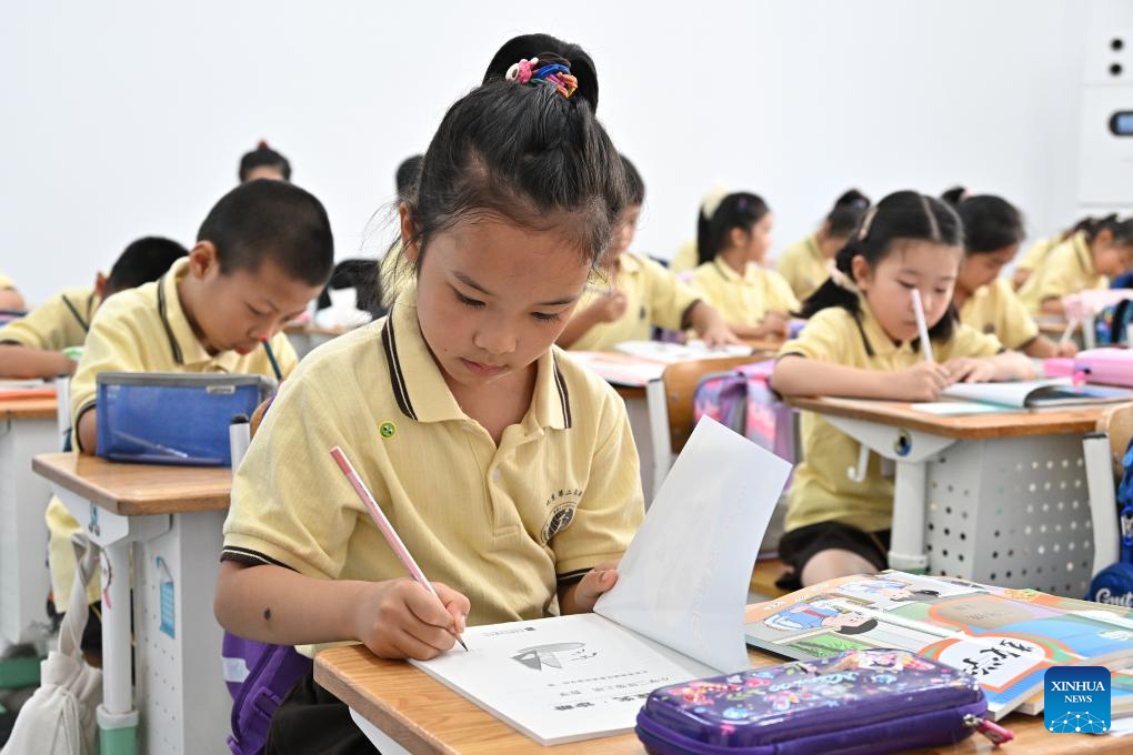 Students attend a class at a primary school in Changxing County, east China's Zhejiang Province, Sept. 1, 2023. The new school semester kicked off in many parts of China on Friday. (Photo by Tan Yunfeng/Xinhua)