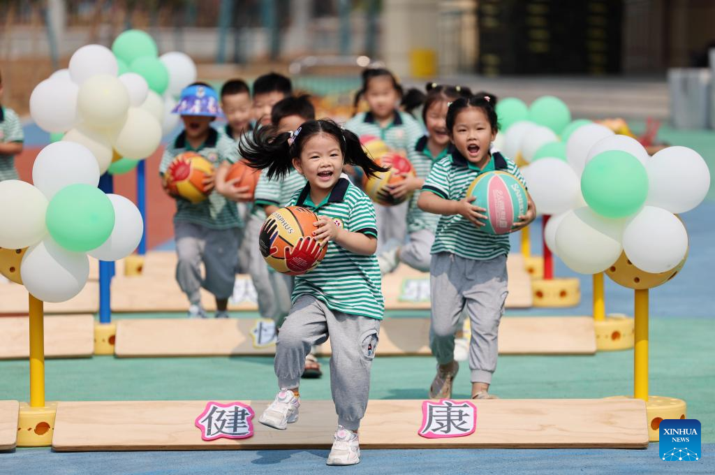 Children take part in a game at a kindergarten in Yinan County of Linyi City, east China's Shandong Province, Sept. 1, 2023. The new school semester kicked off in many parts of China on Friday. (Photo by Wang Yanbing/Xinhua)