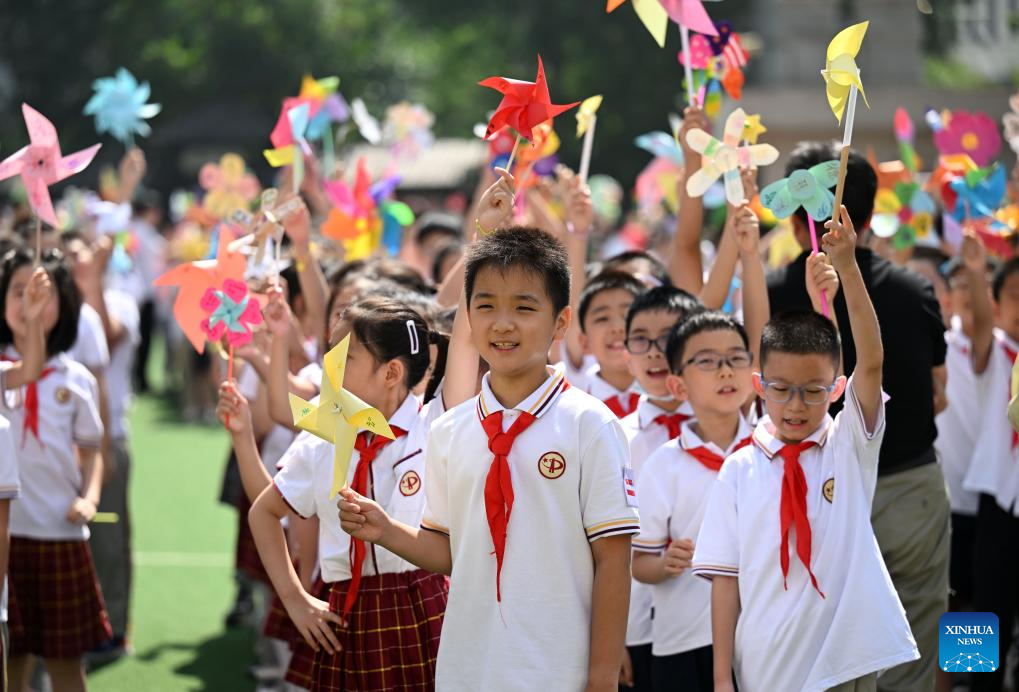 Students display handmade paper pinwheels at a primary school in Heping District, north China's Tianjin, Sept. 1, 2023. The new school semester kicked off in many parts of China on Friday. (Xinhua/Zhao Zishuo)