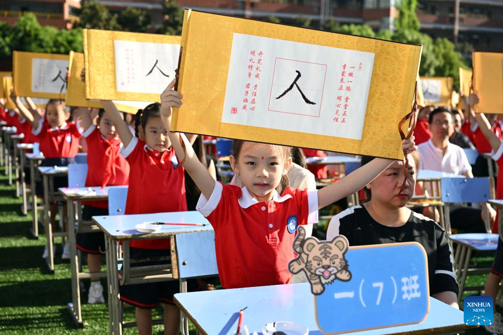 Students display calligraphy works featuring the Chinese character "ren" (meaning "person" or "human") at a primary school in Hefei, east China's Anhui Province, Sept. 1, 2023. The new school semester kicked off in many parts of China on Friday. (Xinhua/Zhou Mu)