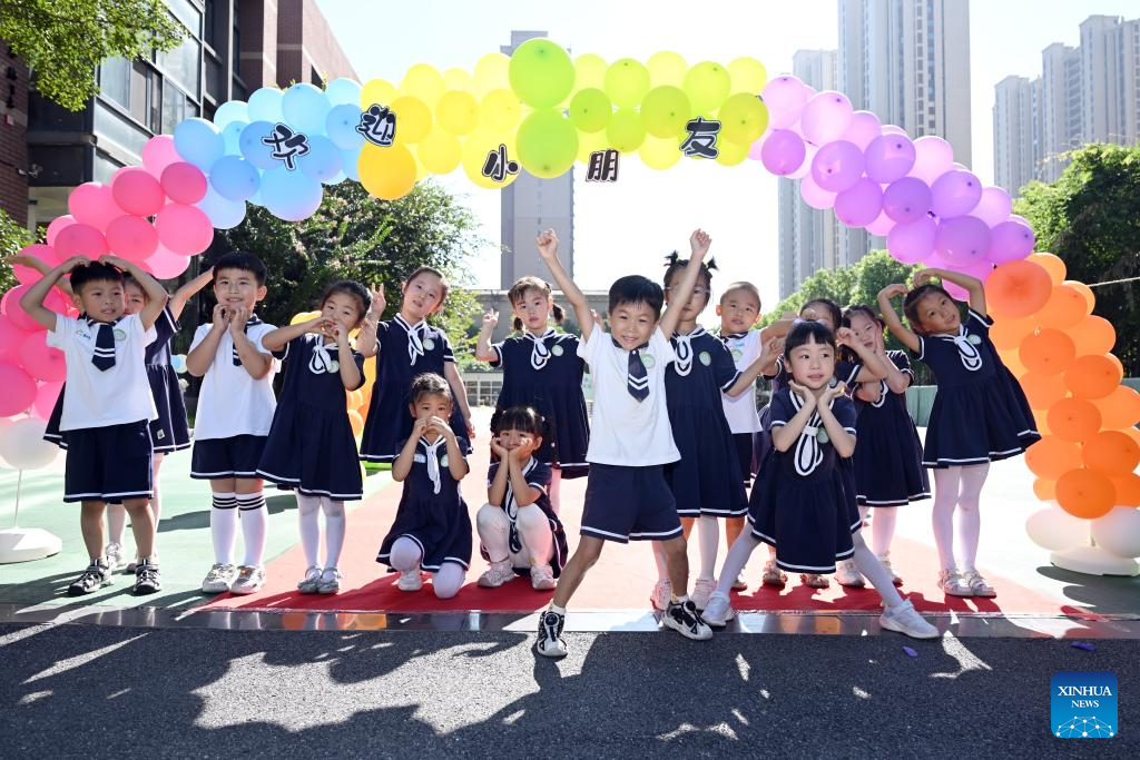 Children pose for a group photo at a kindergarten in Hefei, east China's Anhui Province, Sept. 1, 2023. The new school semester kicked off in many parts of China on Friday. (Xinhua/Zhou Mu)