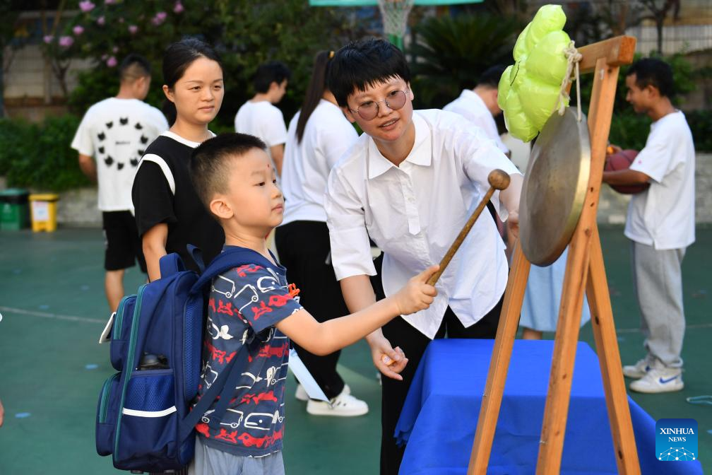 A boy beats a gong to encourage himself at a primary school in Changsha, central China's Hunan Province, Sept. 1, 2023. New school semester kicked off in many parts of China on Friday. (Xinhua/Chen Zhenhai)