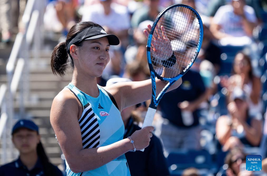 Wang Xinyu of China celebrates after winning the women's singles third round match against Anna Karolina Schmiedlova of Slovakia at the 2023 US Open tennis championships in New York, the United States, Sept. 1, 2023. (Xinhua/Liu Jie)