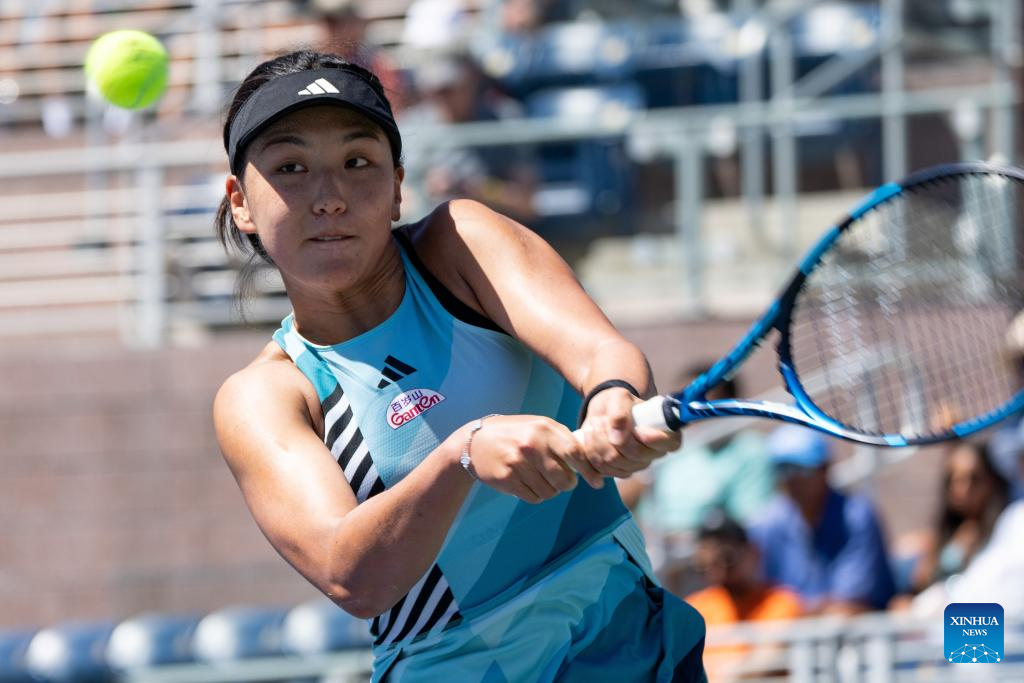 Wang Xinyu of China hits a return during the women's singles third round match against Anna Karolina Schmiedlova of Slovakia at the 2023 US Open tennis championships in New York, the United States, Sept. 1, 2023. (Xinhua/Liu Jie)
