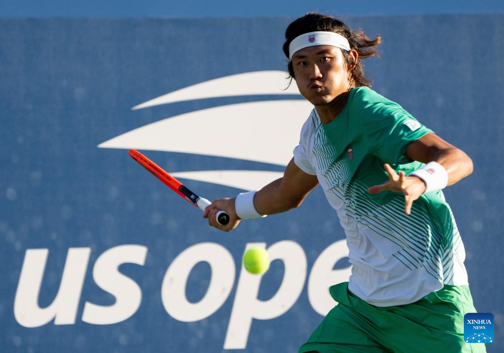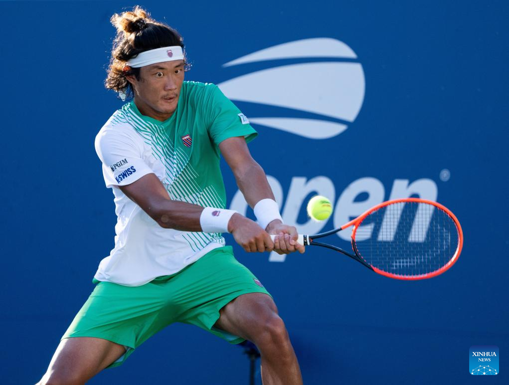 Zhang Zhizhen of China hits a return during the men's singles third round match against Rinky Hijikata of Australia at the 2023 US Open tennis championships in New York, the United States, Sept. 1, 2023. (Xinhua/Liu Jie)