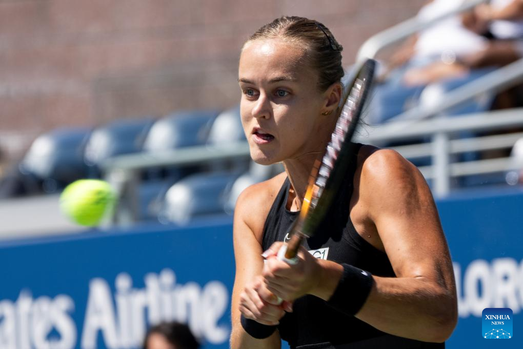 Anna Karolina Schmiedlova of Slovakia hits a return during the women's singles third round match against Wang Xinyu of China at the 2023 US Open tennis championships in New York, the United States, Sept. 1, 2023. (Xinhua/Liu Jie)