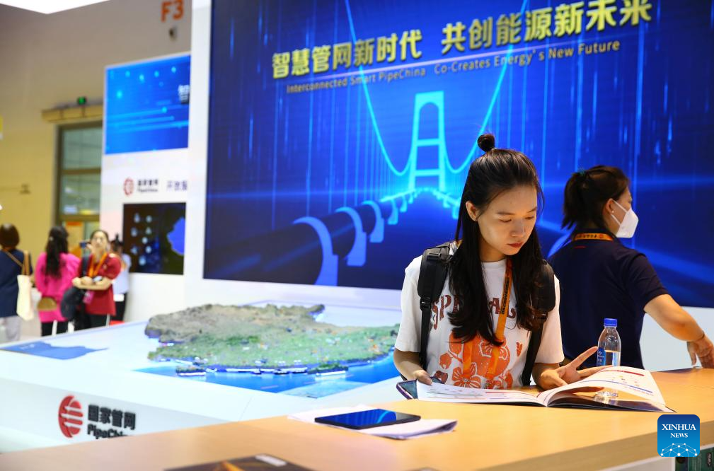 An exhibitor (C) introduces a booth to the press at the China National Convention Center in Beijing, capital of China, Sept. 1, 2023.
