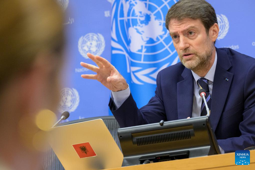 Ferit Hoxha, Albania's UN ambassador, whose country holds the Security Council presidency for the month, briefs reporters at the UN headquarters in New York, on Sept. 1, 2023. Ukrainian President Volodymyr Zelensky is expected to come to the United Nations headquarters in September, said Ferit Hoxha. (Manuel Elas/UN Photo/Handout via Xinhua)