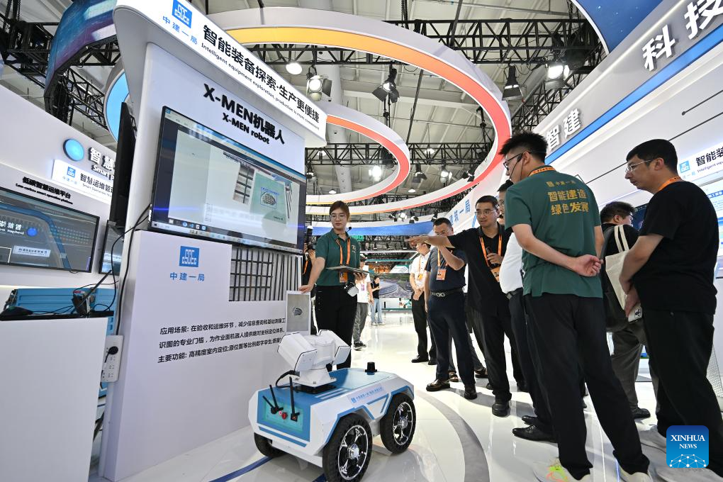 Visitors learn about a robot at the booth of China Construction First Group during the 2023 China International Fair for Trade in Services (CIFTIS) at Shougang Park in Beijing, capital of China, Sept. 3, 2023. (Xinhua/Li Xin)
