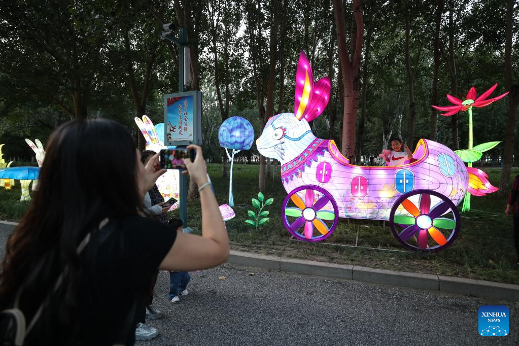 People take photos while visiting a lantern show at the Liaohe wetland park in Panjin, northeast China's Liaoning Province, Sept. 1, 2023. Hundreds of light installations were displayed at the lantern show. (Xinhua/Pan Yulong)