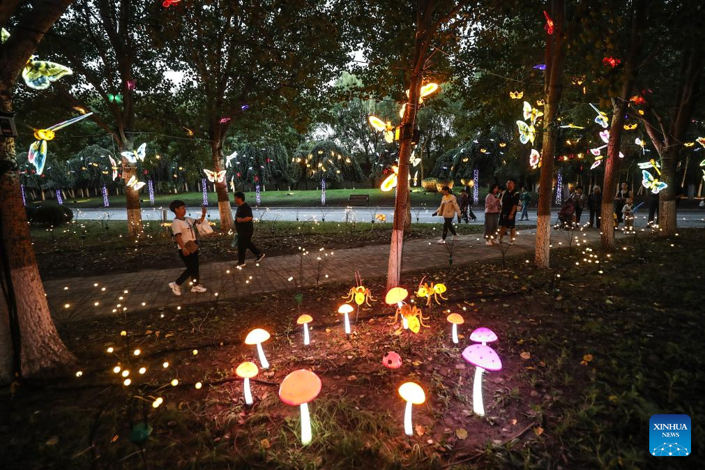 People watch a lantern show at the Liaohe wetland park in Panjin, northeast China's Liaoning Province, Sept. 1, 2023. Hundreds of light installations were displayed at the lantern show. (Xinhua/Pan Yulong)
