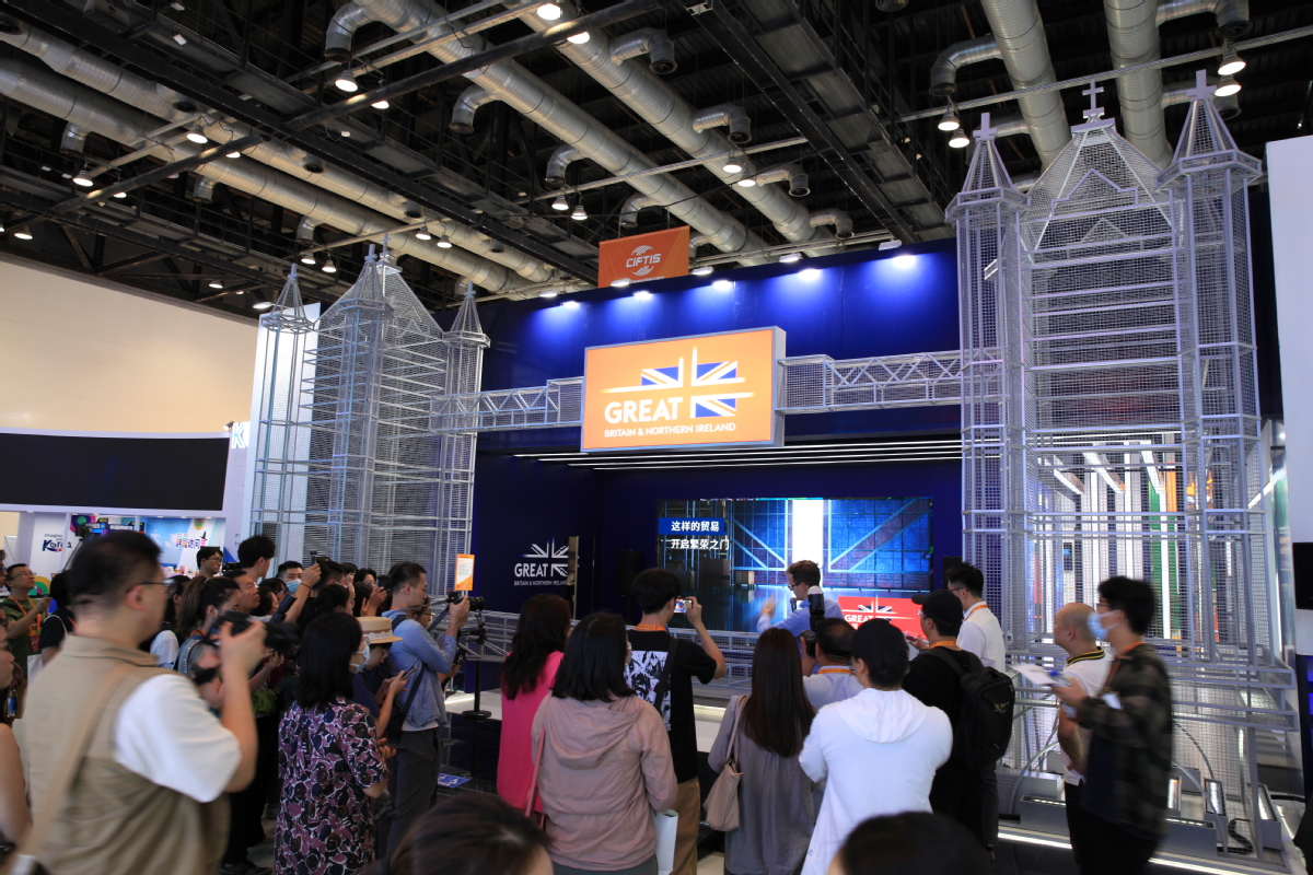 The British exhibition pavilion attracts a throng of journalists prior to the opening of the 2023 CIFTIS. WANG JING/CHINA DAILY