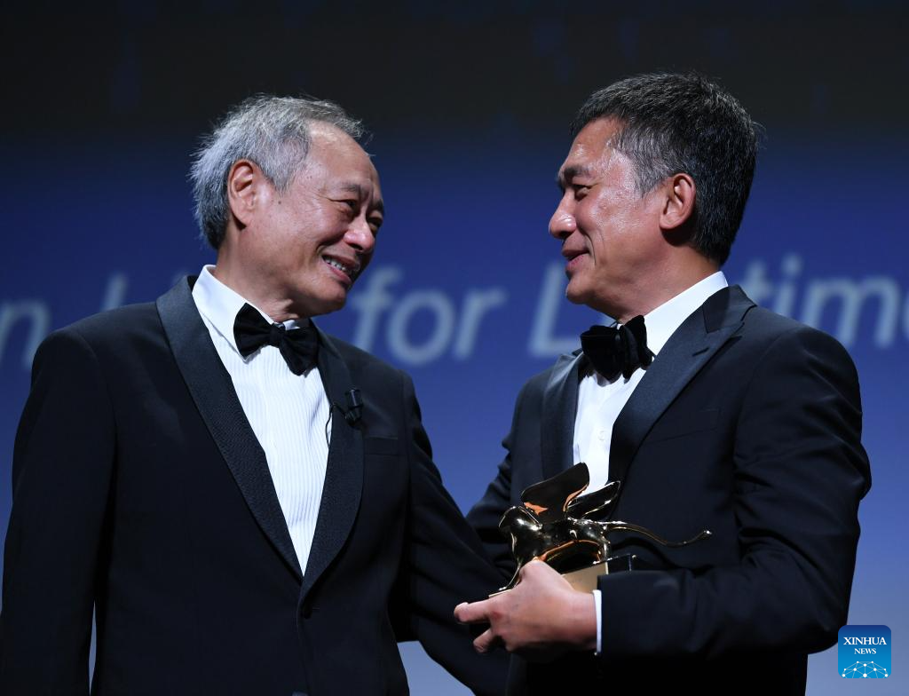 Director Ang Lee (L) and Actor Tony Leung Chiu-Wai attend an award ceremony during the 80th Venice International Film Festival in Venice, Italy, on Sept. 2, 2023. Tony Leung Chiu-Wai of Hong Kong, China was presented with the Golden Lion for Lifetime Achievement during the event on Saturday. (Xinhua/Jin Mamengni)