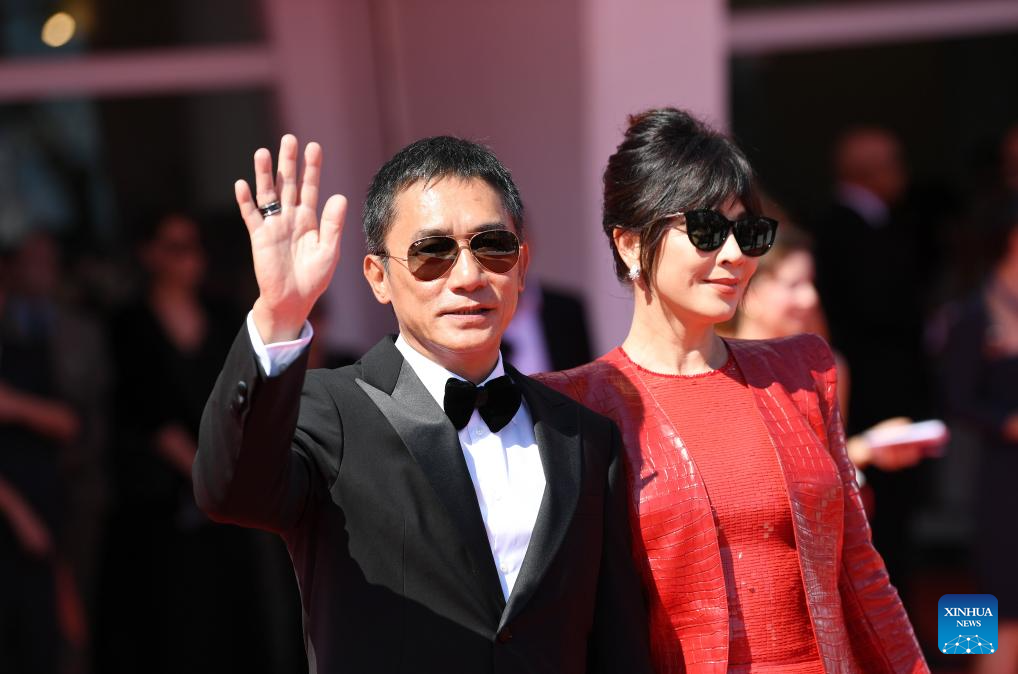 Actor Tony Leung Chiu-Wai (L) and actress Carina Lau pose during the 80th Venice International Film Festival in Venice, Italy, on Sept. 2, 2023. Tony Leung Chiu-Wai of Hong Kong, China was presented with the Golden Lion for Lifetime Achievement during the event on Saturday. (Xinhua/Jin Mamengni)