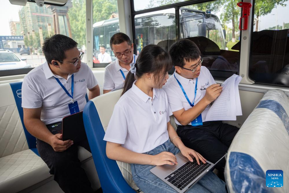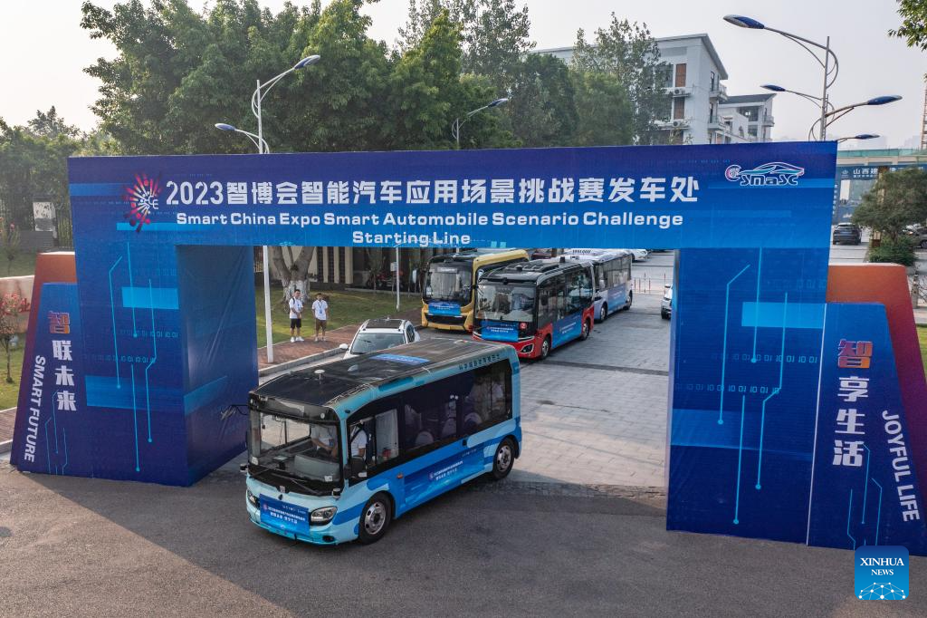 A self-driving bus takes part in the Smart China Expo Smart Automobile Scenario Challenge in Yongchuan District of southwest China's Chongqing, Sept. 2, 2023. The challenge was held in Yongchuan District of Chongqing from Sept. 1 to 3. More than 180 industry representatives and 19 teams from the field of intelligent vehicles participated in the competition. (Xinhua/Huang Wei)