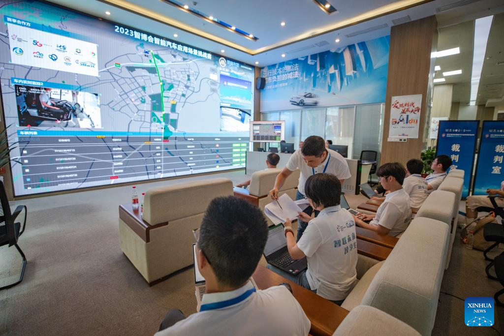 Referees watch participating vehicles via live video during the Smart China Expo Smart Automobile Scenario Challenge in Yongchuan District of southwest China's Chongqing, Sept. 2, 2023. The challenge was held in Yongchuan District of Chongqing from Sept. 1 to 3. More than 180 industry representatives and 19 teams from the field of intelligent vehicles participated in the competition. (Xinhua/Huang Wei)