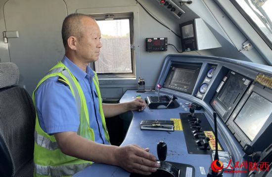 A Chang'an China-Europe freight train driven by Qin Kai arrives at a railway station in Xinfeng township, Xi'an, capital of northwest China's Shaanxi Province, on July 25, 2023. (People's Daily Online/Jia Kailu)