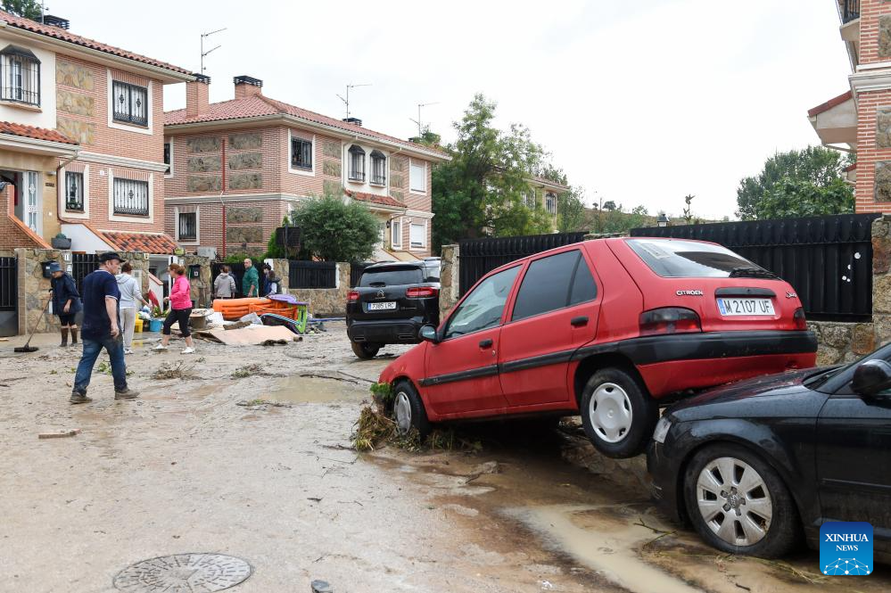 Residents clear up a road after storms in Villamanta of Madrid, Spain, Sept. 4, 2023. Spain's State Meteorological Agency (AEMET) has declared a red alert for extreme weather and heavy rainfall in central and eastern Spain on Sunday. (Photo by Gustavo Valiente/Xinhua)