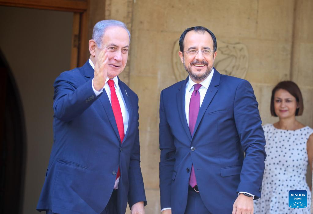 Cypriot President Nikos Christodoulides (R, Front) welcomes Israeli Prime Minister Benjamin Netanyahu (1st L) at the Presidential Palace in Nicosia, Cyprus, on Sept. 4, 2023. (Photo by George Christophorou/Xinhua)