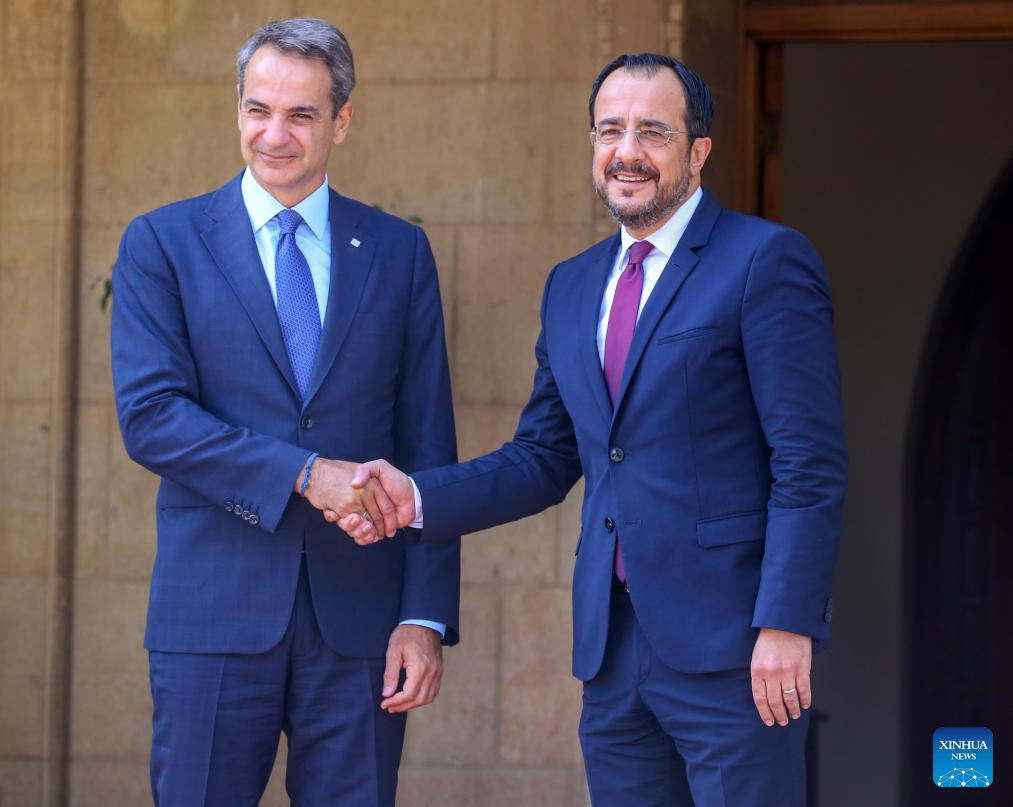 Cypriot President Nikos Christodoulides (R) welcomes Greek Prime Minister Kyriakos Mitsotakis at the Presidential Palace in Nicosia, Cyprus, on Sept. 4, 2023. (Photo by George Christophorou/Xinhua)