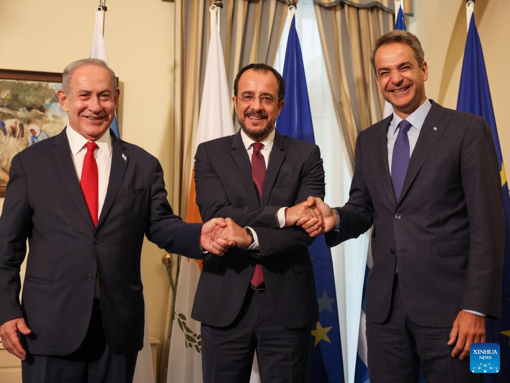 Cypriot President Nikos Christodoulides (C) shakes hands with Greek Prime Minister Kyriakos Mitsotakis (R) and Israeli Prime Minister Benjamin Netanyahu at the Presidential Palace in Nicosia, Cyprus, on Sept. 4, 2023. (PIO/Handout via Xinhua)