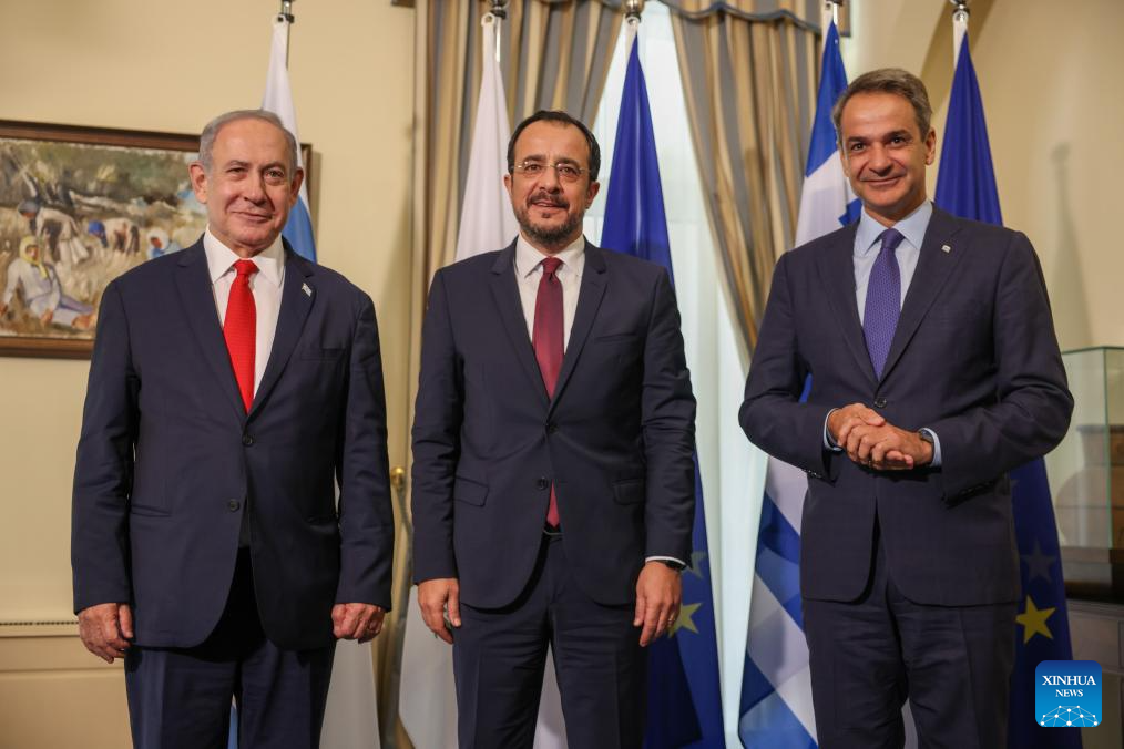 Cypriot President Nikos Christodoulides (C) meets with Greek Prime Minister Kyriakos Mitsotakis (R) and Israeli Prime Minister Benjamin Netanyahu at the Presidential Palace in Nicosia, Cyprus, on Sept. 4, 2023. (PIO/Handout via Xinhua)