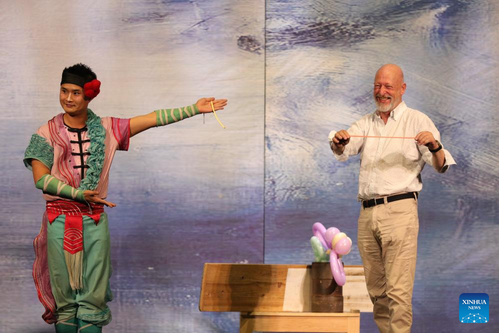 An acrobat interacts with an audience during the acrobatic show "Dream Journey" at EDP Gran Via Theater in Madrid, Spain, Sept. 3, 2023. The 700th performance of the global tour of "Dream Journey" was held here on Sunday. (Xinhua/Meng Dingbo)