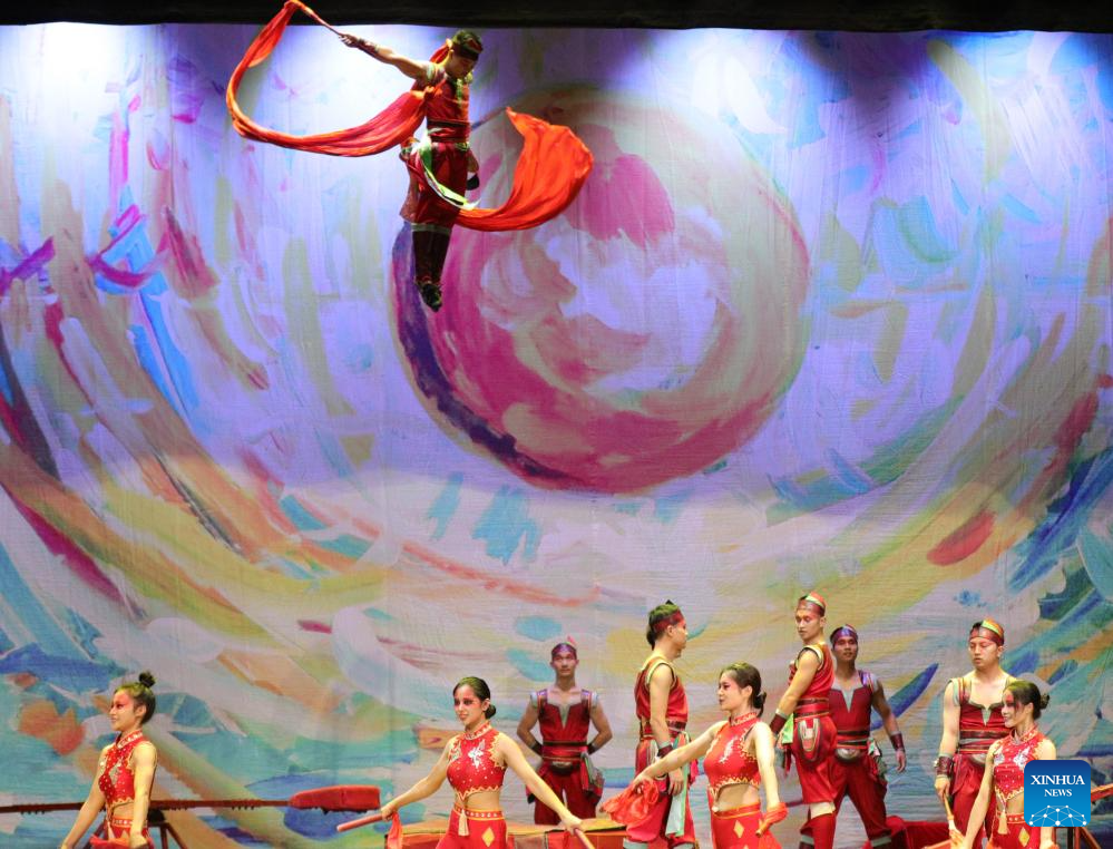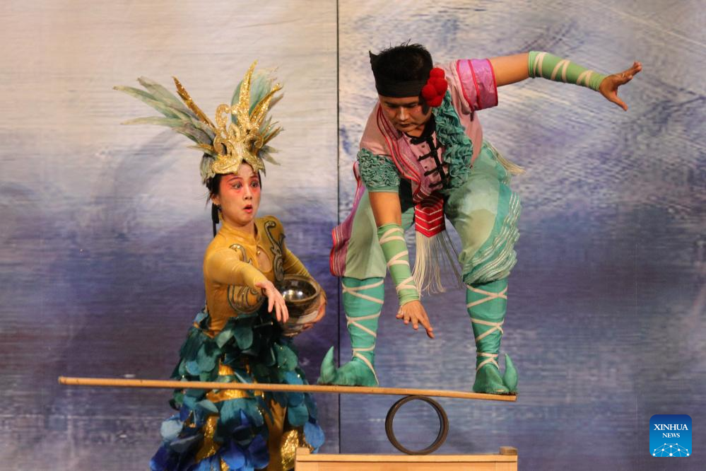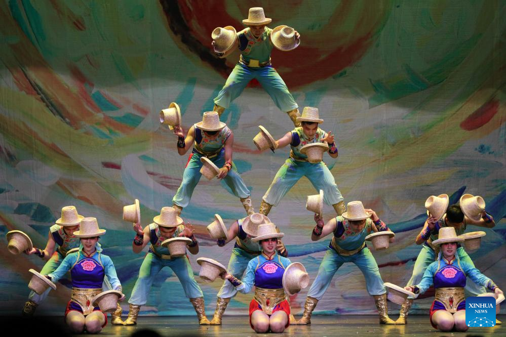 Acrobats from China's Hunan Acrobatic Art Theater perform during the acrobatic show "Dream Journey" at EDP Gran Via Theater in Madrid, Spain, Sept. 3, 2023. The 700th performance of the global tour of "Dream Journey" was held here on Sunday. (Xinhua/Meng Dingbo)