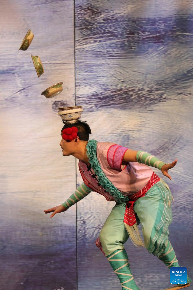 An acrobat from China's Hunan Acrobatic Art Theater performs during the acrobatic show "Dream Journey" at EDP Gran Via Theater in Madrid, Spain, Sept. 3, 2023. The 700th performance of the global tour of "Dream Journey" was held here on Sunday. (Xinhua/Meng Dingbo)