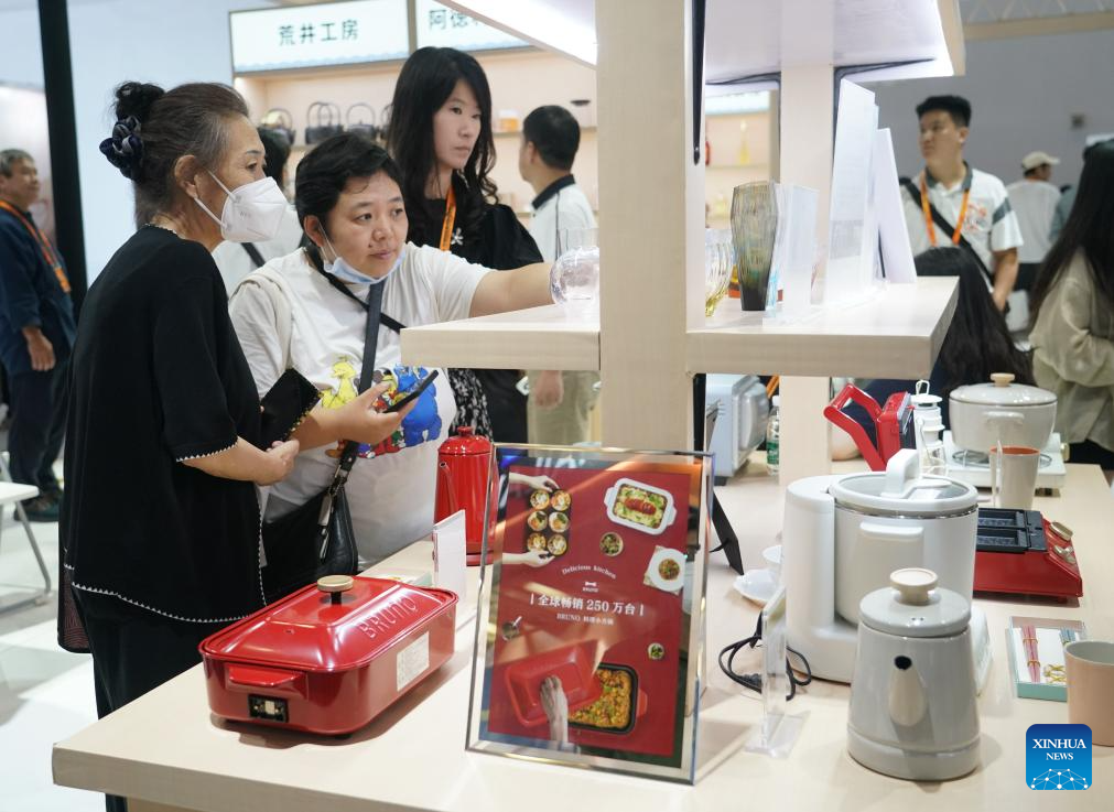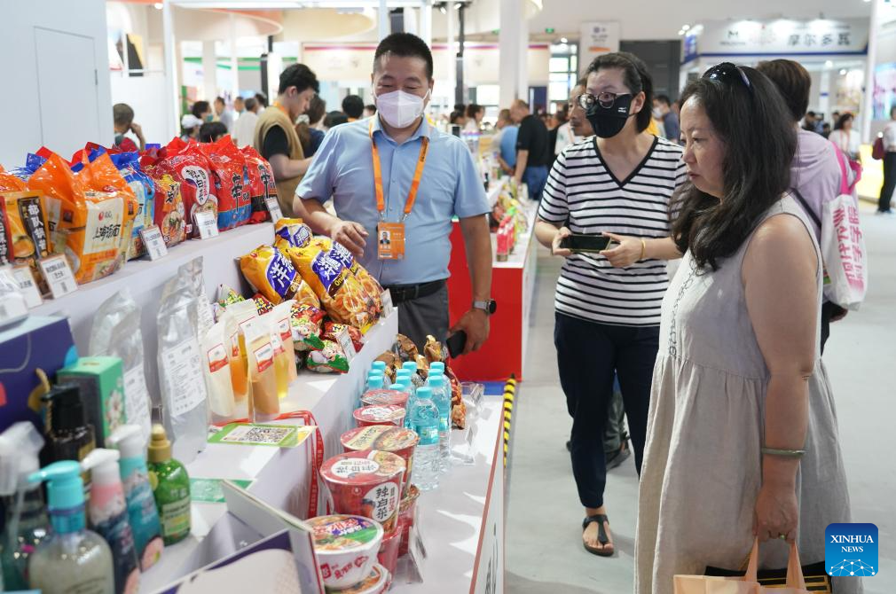 Visitors learn about beauty products at the booth of South Korea during the 2023 China International Fair for Trade in Services (CIFTIS) at China National Convention Center in Beijing, capital of China, Sept. 4, 2023. Themed "Opening-up leads development, cooperation delivers the future," the 2023 CIFTIS is held in Beijing from Sept. 2 to 6. (Xinhua/Li Xin)