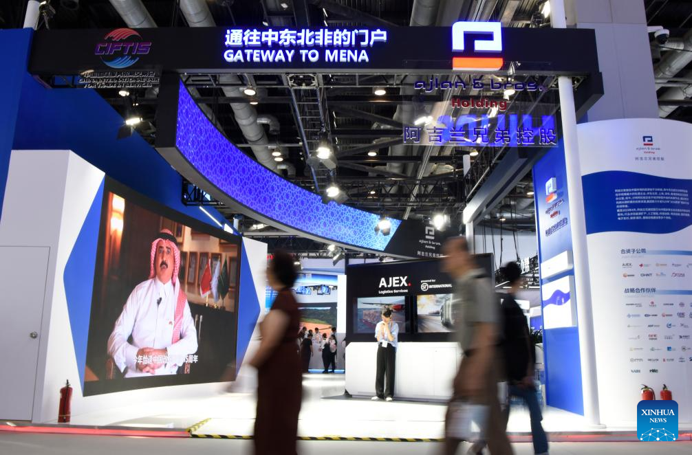 Visitors walk past the booth of Ajlan &Bros. Holding during the 2023 China International Fair for Trade in Services (CIFTIS) at China National Convention Center in Beijing, capital of China, Sept. 4, 2023. Themed "Opening-up leads development, cooperation delivers the future," the 2023 CIFTIS is held in Beijing from Sept. 2 to 6. (Xinhua/Wu Wei)