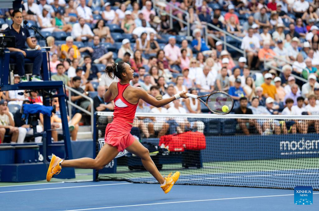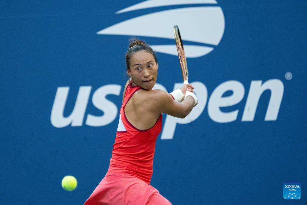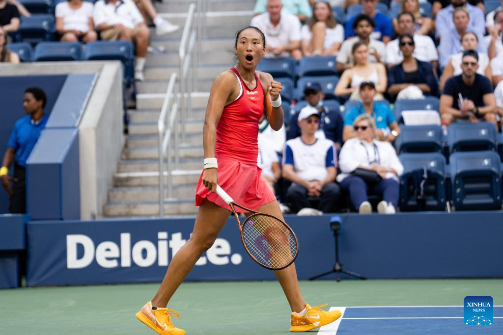 NEW YORK, Sept. 4 (Xinhua) -- Chinese sensation Zheng Qinwen powered into the quarterfinals of the US Open on Monday with a straight-set win over Ons Jabeur from Tunisia 6-2 and 6-4.