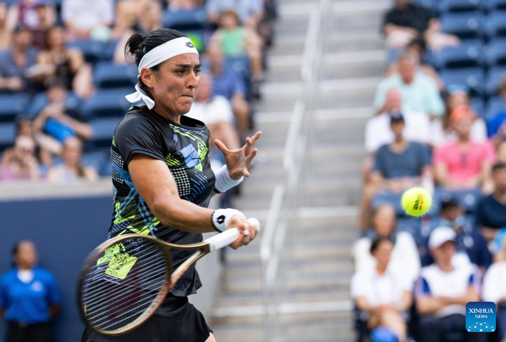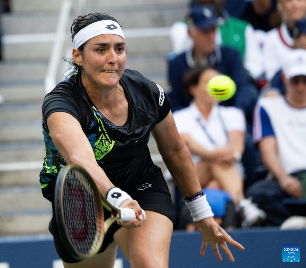 Ons Jabeur of Tunisia hits a return during the women's singles fourth round match against Zheng Qinwen of China at the 2023 US Open tennis championships in New York, the United States, Sept. 4, 2023. (Xinhua/Liu Jie)