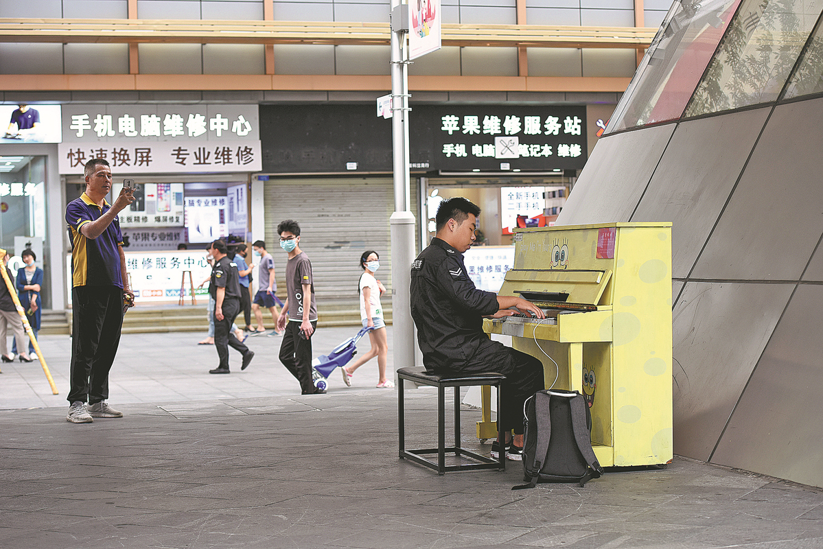 A security guard plays pianos placed under escalators in Huaqiangbei. YI YANG/FOR CHINA DAILY