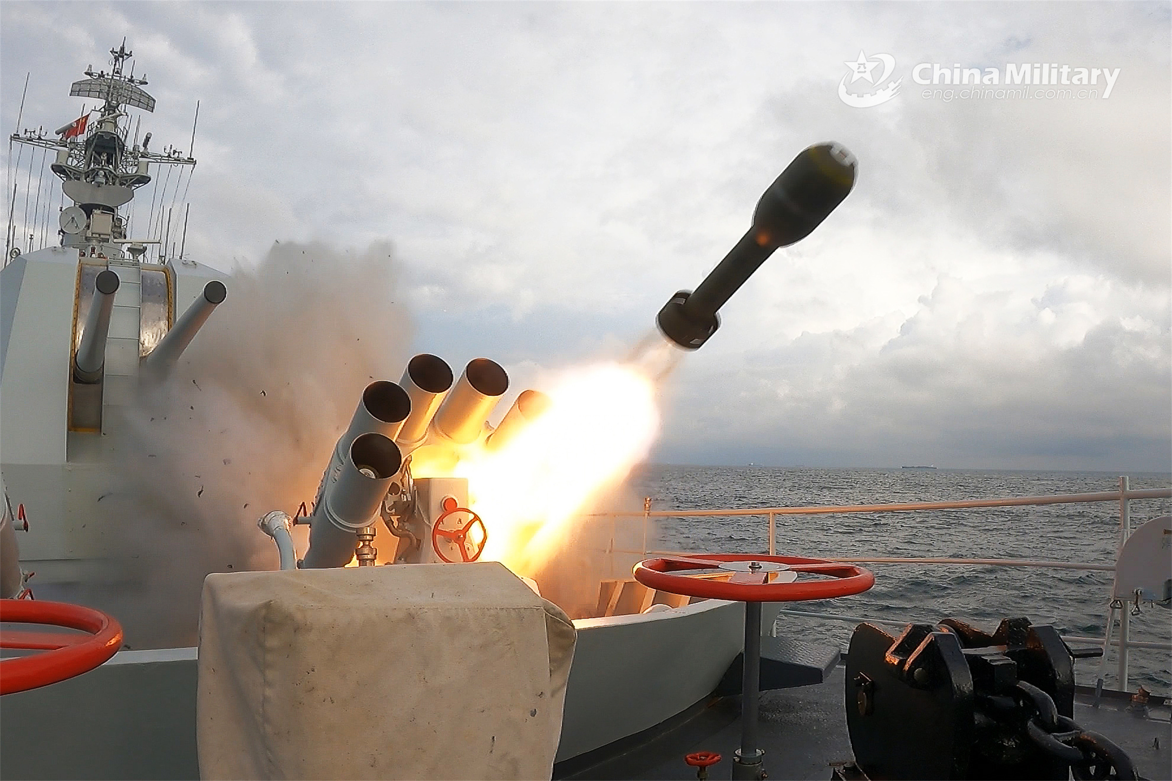 The guided-missile frigate Jiaxing attached to a frigate flotilla with the navy under the PLA Eastern Theater Command fires its rocket-propelled depth charges at mock sea targets during a real-combat training exercise in August. (eng.chinamil.com.cn/Photo by Ren Wei)
