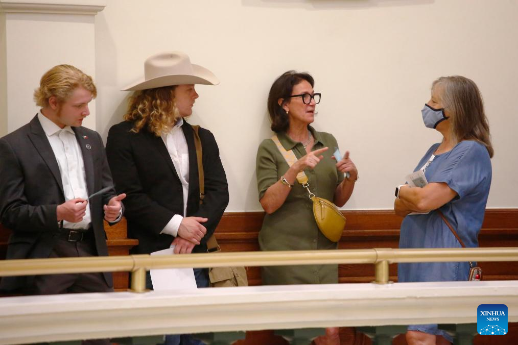 People talk as they wait for an impeachment trial of suspended state Attorney General Ken Paxton over yearslong charges in Austin, Texas, the United States, on Sept. 5, 2023. The Senate of the south-central U.S. state of Texas on Tuesday began an impeachment trial of suspended state Attorney General Ken Paxton, a Republican, over yearslong charges including corruption, lawbreaking and power abusing. (Photo by Chengyue Lao/Xinhua)