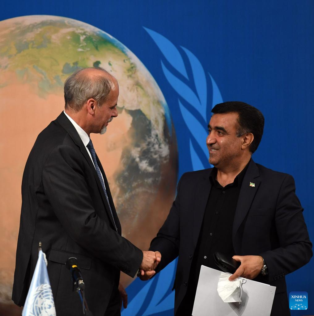 Ali Salajegheh (R), Iranian vice president and head of the Department of Environment (DoE), shakes hands with Stefan Priesner, the United Nations resident coordinator for Iran, during a press conference ahead of the International Conference on Combating Sand and Dust Storms in Tehran, Iran, on Sept. 5, 2023. Iran and China have "good capacities" for environmental cooperation, especially in combating dust and sand storms, said Ali Salajegheh, Iran's vice president and head of the Department of Environment (DoE). (Xinhua/Shadati)