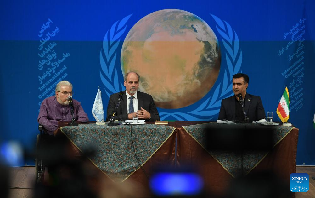 Stefan Priesner (R), the United Nations resident coordinator for Iran, speaks at a press conference ahead of the International Conference on Combating Sand and Dust Storms in Tehran, Iran, on Sept. 5, 2023. Iran and China have "good capacities" for environmental cooperation, especially in combating dust and sand storms, said Ali Salajegheh, Iran's vice president and head of the Department of Environment (DoE). (Xinhua/Shadati)
