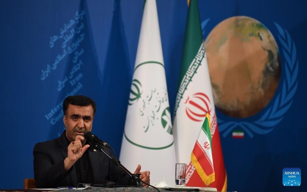 Ali Salajegheh, Iranian vice president and head of the Department of Environment (DoE), speaks at a press conference ahead of the International Conference on Combating Sand and Dust Storms in Tehran, Iran, on Sept. 5, 2023. Iran and China have "good capacities" for environmental cooperation, especially in combating dust and sand storms, said Ali Salajegheh, Iran's vice president and head of the Department of Environment (DoE). (Xinhua/Shadati)