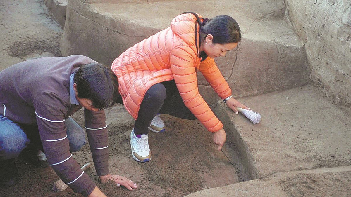 Ding Lina (right), a researcher at the Beijing Archaeological Research Institute, takes part in an excavation at the Zhongdu site during the winter in 2019. CHINA DAILY