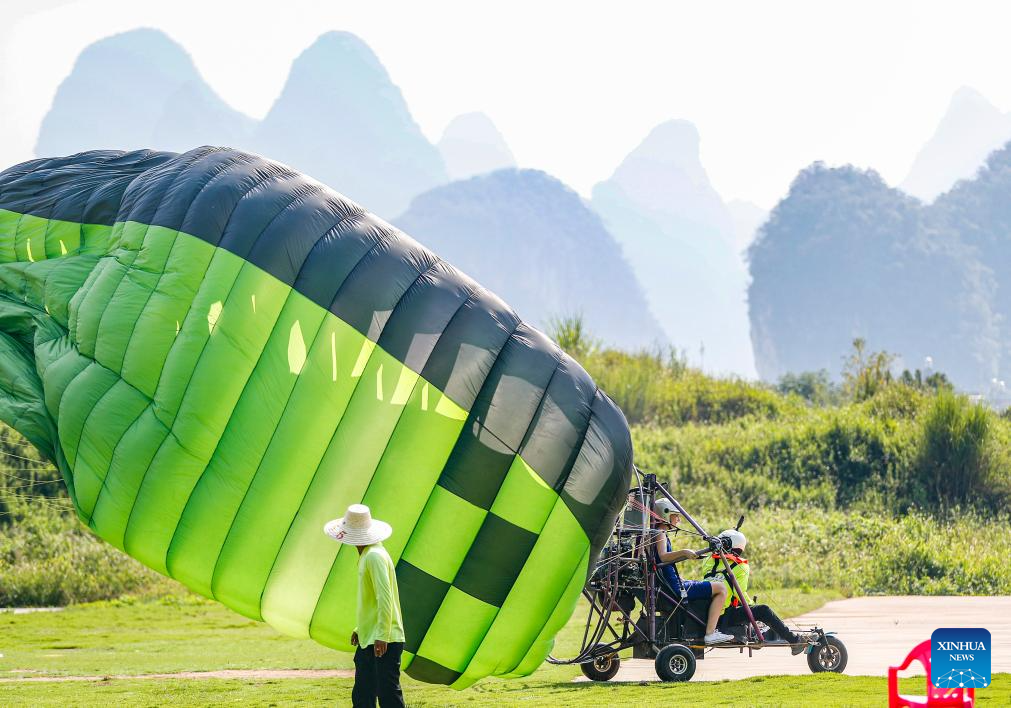 A tourist parasails with a coach in Guilin, south China's Guangxi Zhuang Autonomous Region, Sept. 5, 2023. (Xinhua/Hu Xingyu)