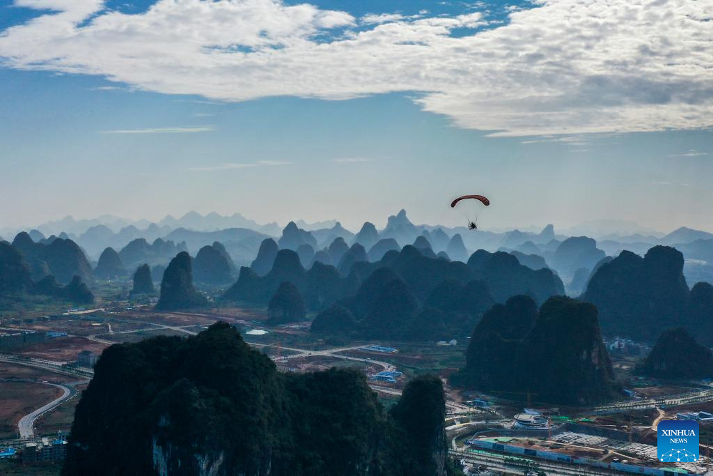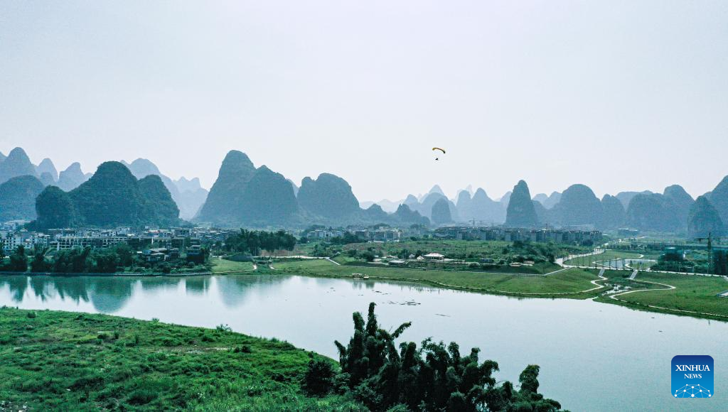 In this aerial photo, a tourist parasails with a coach in Guilin, south China's Guangxi Zhuang Autonomous Region, Sept. 5, 2023. (Xinhua/Hu Xingyu)