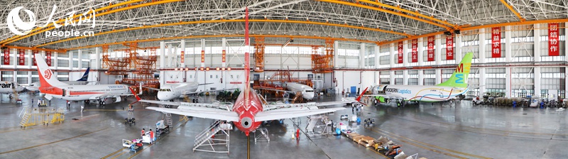 Photo shows a panoramic view of the maintenance hangar of an integrated aircraft maintenance base at Haikou airport comprehensive bonded zone in Haikou, capital of south China's Hainan Province. (People's Daily Online/Meng Fansheng)