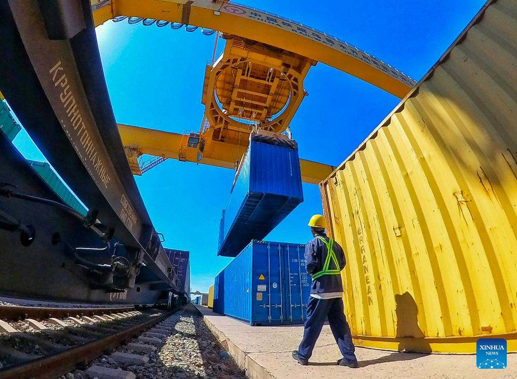 A crane operates at the load-transfer yard of Horgos station in Horgos, northwest China's Xinjiang Uygur Autonomous Region, on Sept. 6, 2023. The number of China-Europe (Central Asia) freight trains passing Horgos Port in northwest China's Xinjiang Uygur Autonomous Region has reached 5,156 by the end of August this year, 11.6 percent higher than that of the same period a year earlier, according to statistics released by the local railway authority. (Xinhua/Zhao Ge)