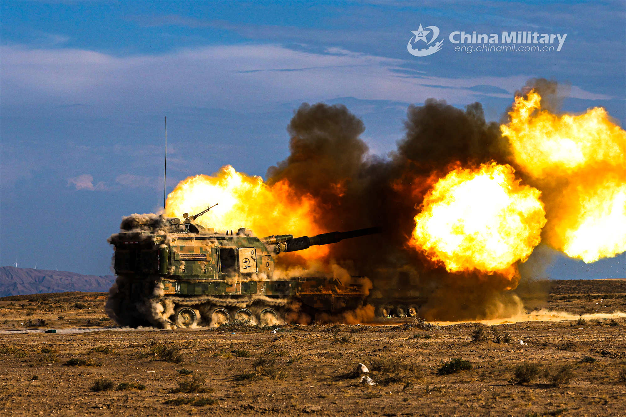 An armored vehicle attached to a brigade under the PLA 82nd Group Army fires its main weapon down range at mock targets during a live-fire test in late August. (eng.chinamil.com.cn/Photo by Cheng Chunlei)