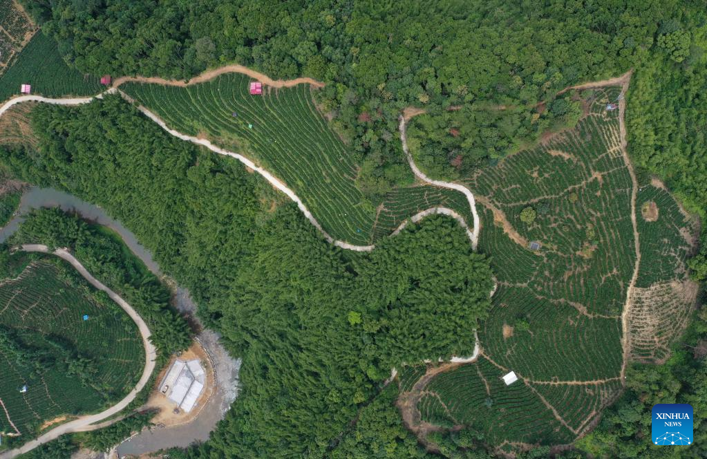 This aerial photo taken on Sept. 6, 2023 shows a tea garden in Liubao Town of Cangwu County in Wuzhou City, south China's Guangxi Zhuang Autonomous Region. (Xinhua/Huang Xiaobang)
