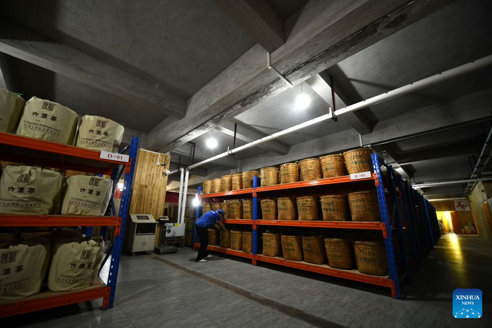 A worker processes tea leaves in a tea company in Wuzhou City, south China's Guangxi Zhuang Autonomous Region, Aug. 25, 2023. (Xinhua/Huang Xiaobang)
